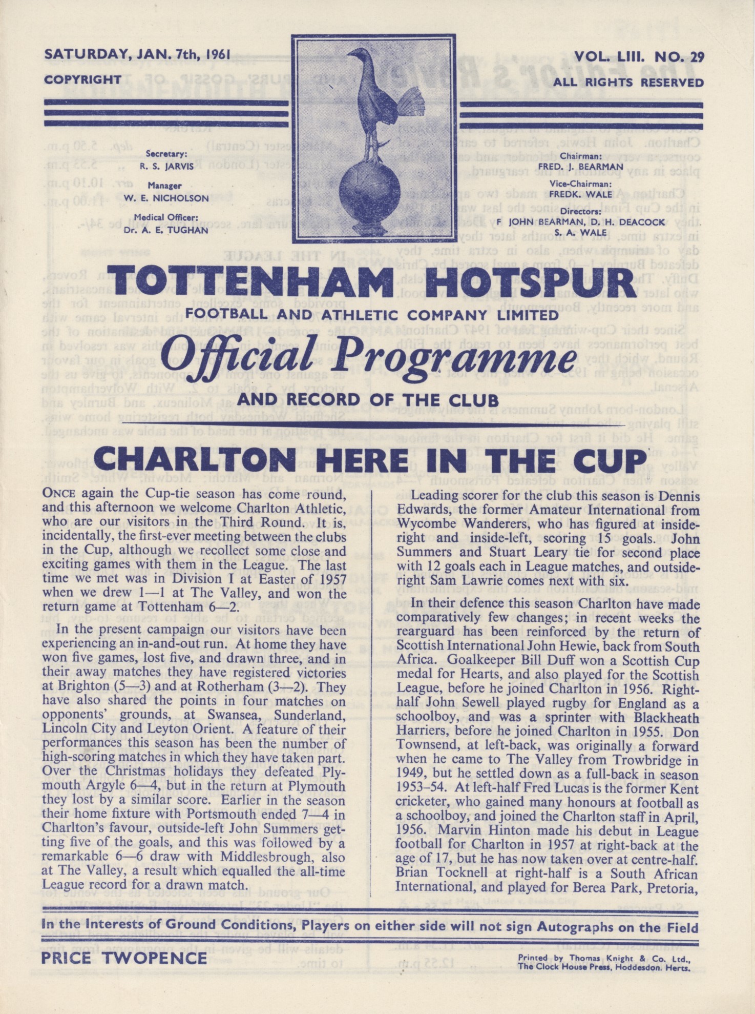 TOTTENHAM HOTSPUR V CHARLTON ATHLETIC 1960-61 FOOTBALL PROGRAMME