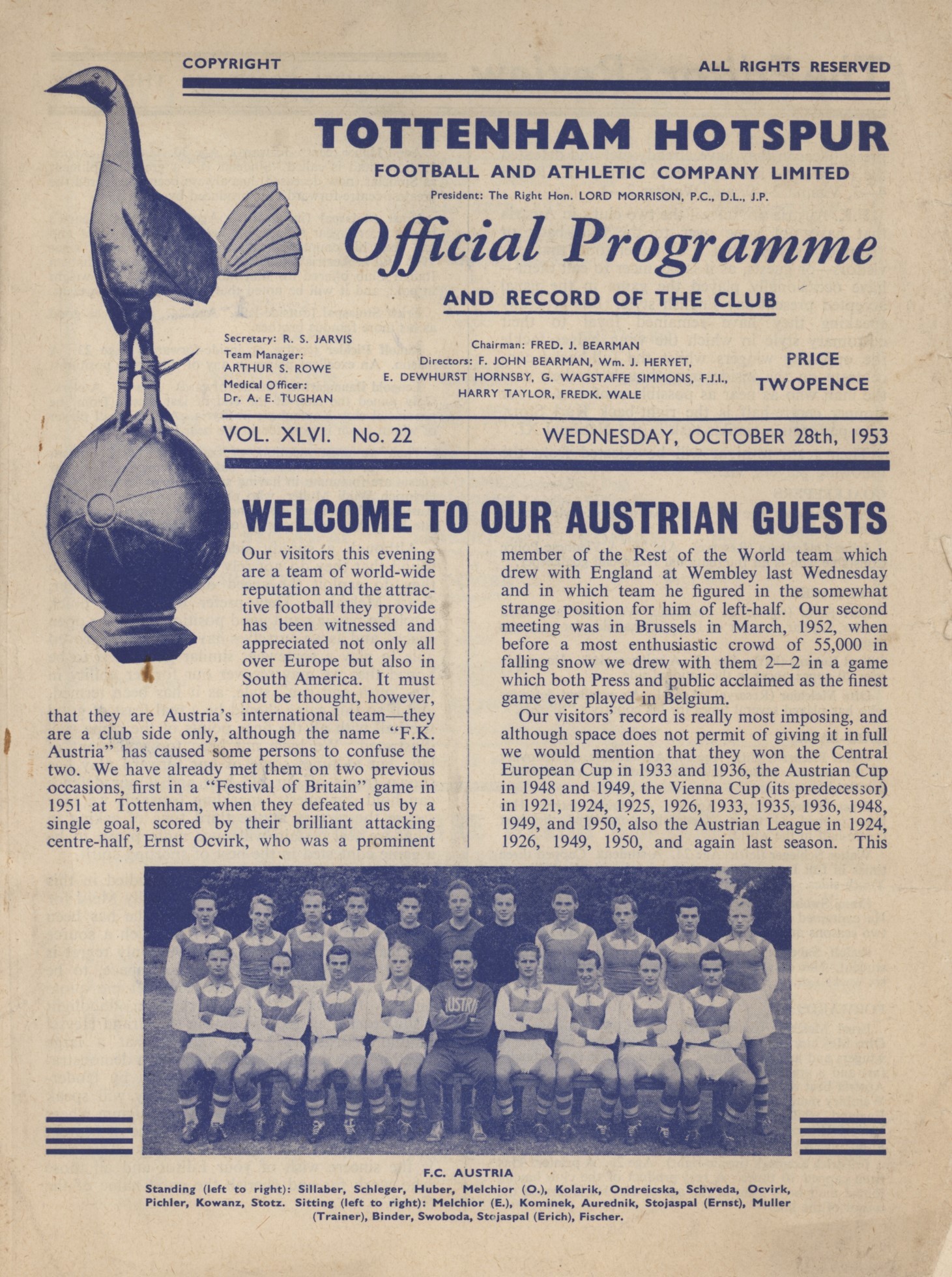 Official football match programme from the friendly match between Spurs and FK Austria played at White Hart Lane on 28th October 1953.