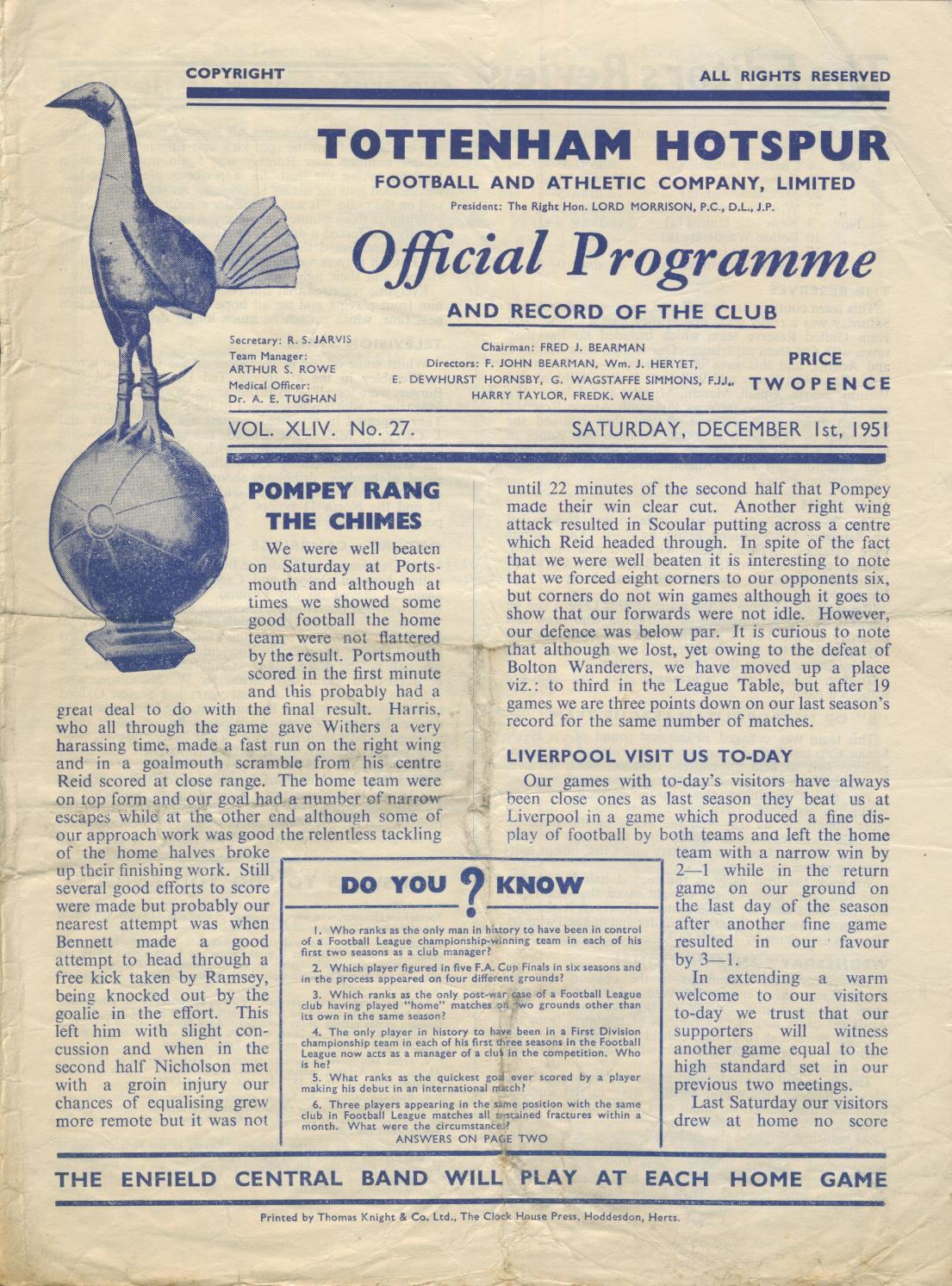 TOTTENHAM HOTSPUR V LIVERPOOL 1951-52 FOOTBALL PROGRAMME