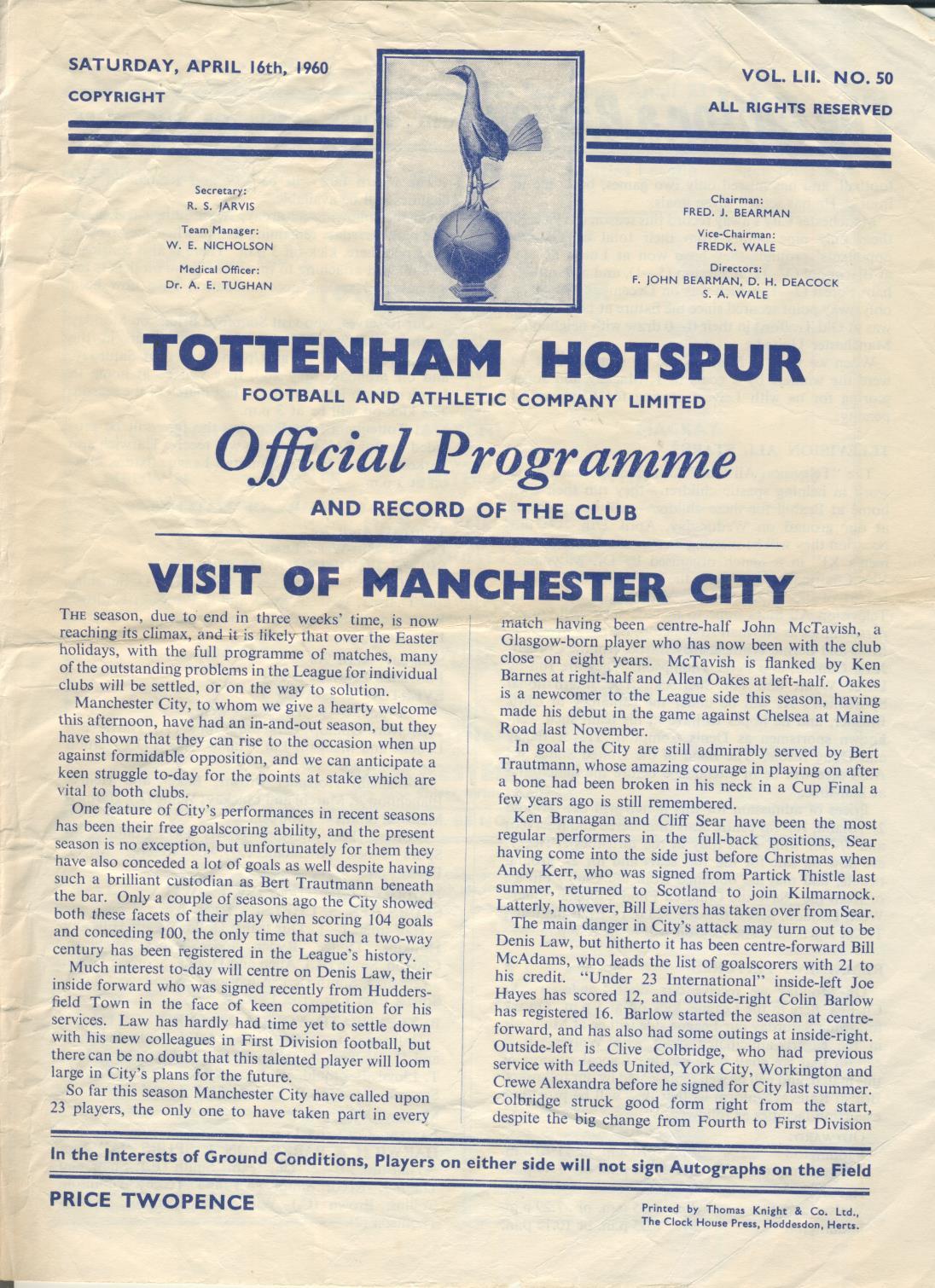 TOTTENHAM HOTSPUR V MANCHESTER CITY 1959-60 FOOTBALL PROGRAMME