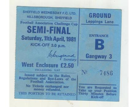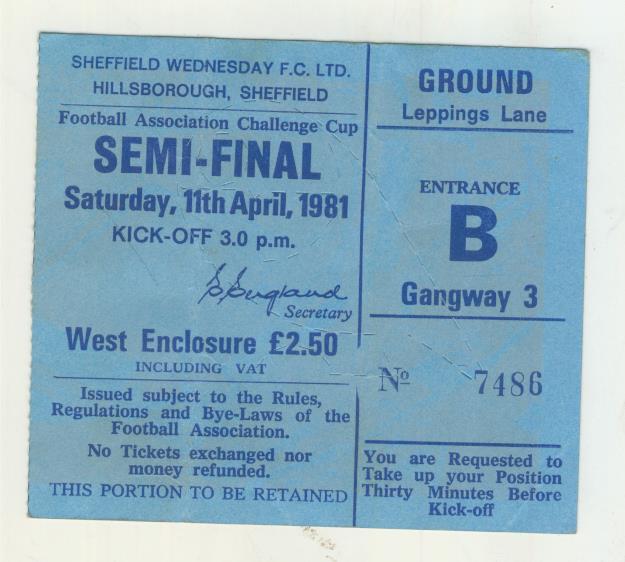 Original ticket stub for the FA Cup semi-final, played at Hillsborough on April 11th, 1981. The match was drawn but Spurs went on to win the replay and the final.