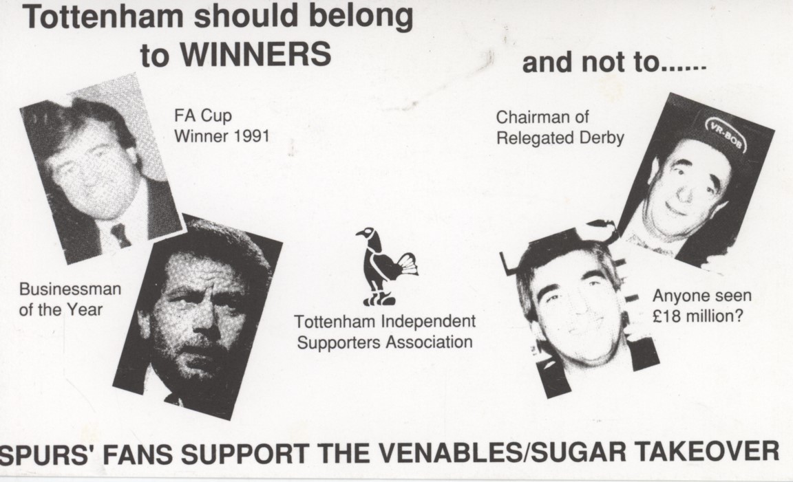 A card produced by the Tottenham Independent Supporters Association to promote the case for Terry Venables and Alan Sugar taking over the club (as opposed to Robert Mawxwell).