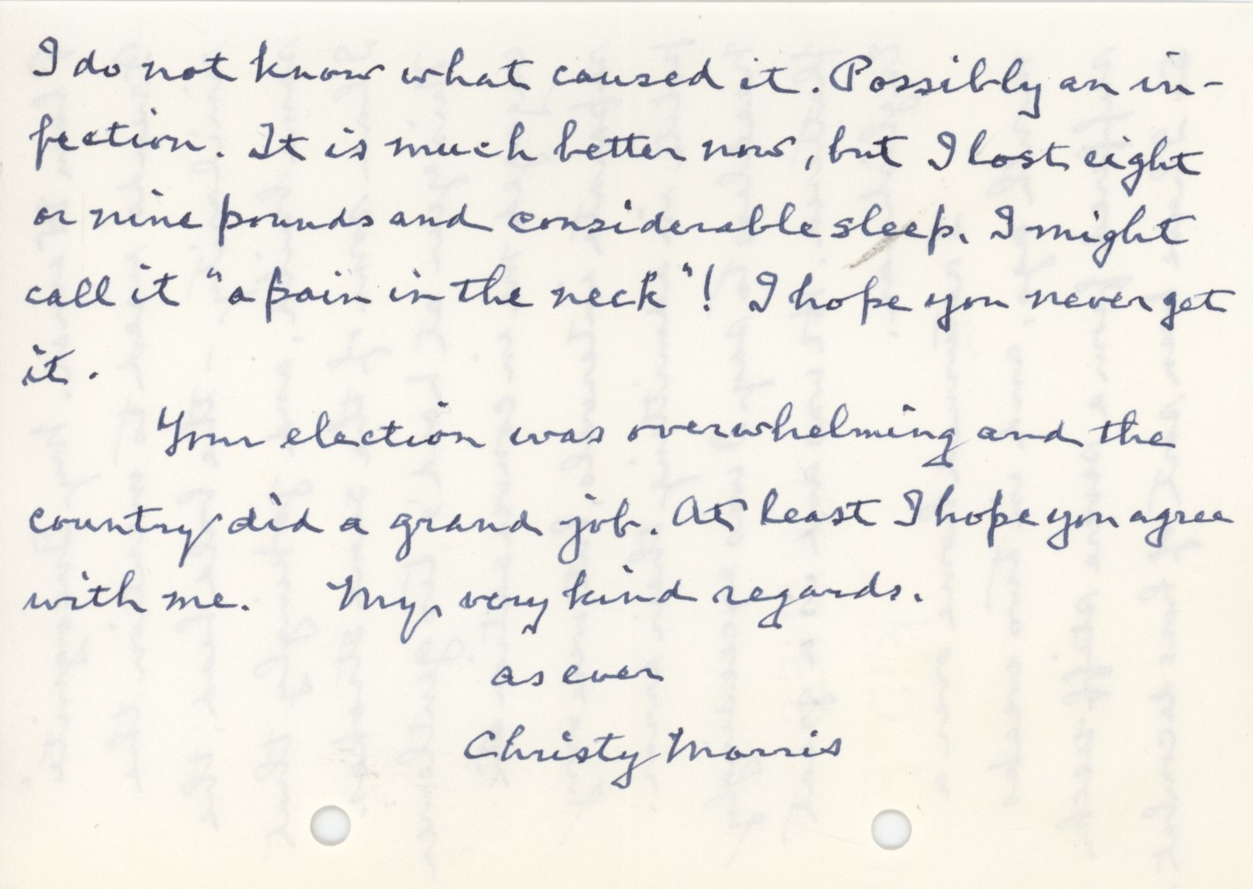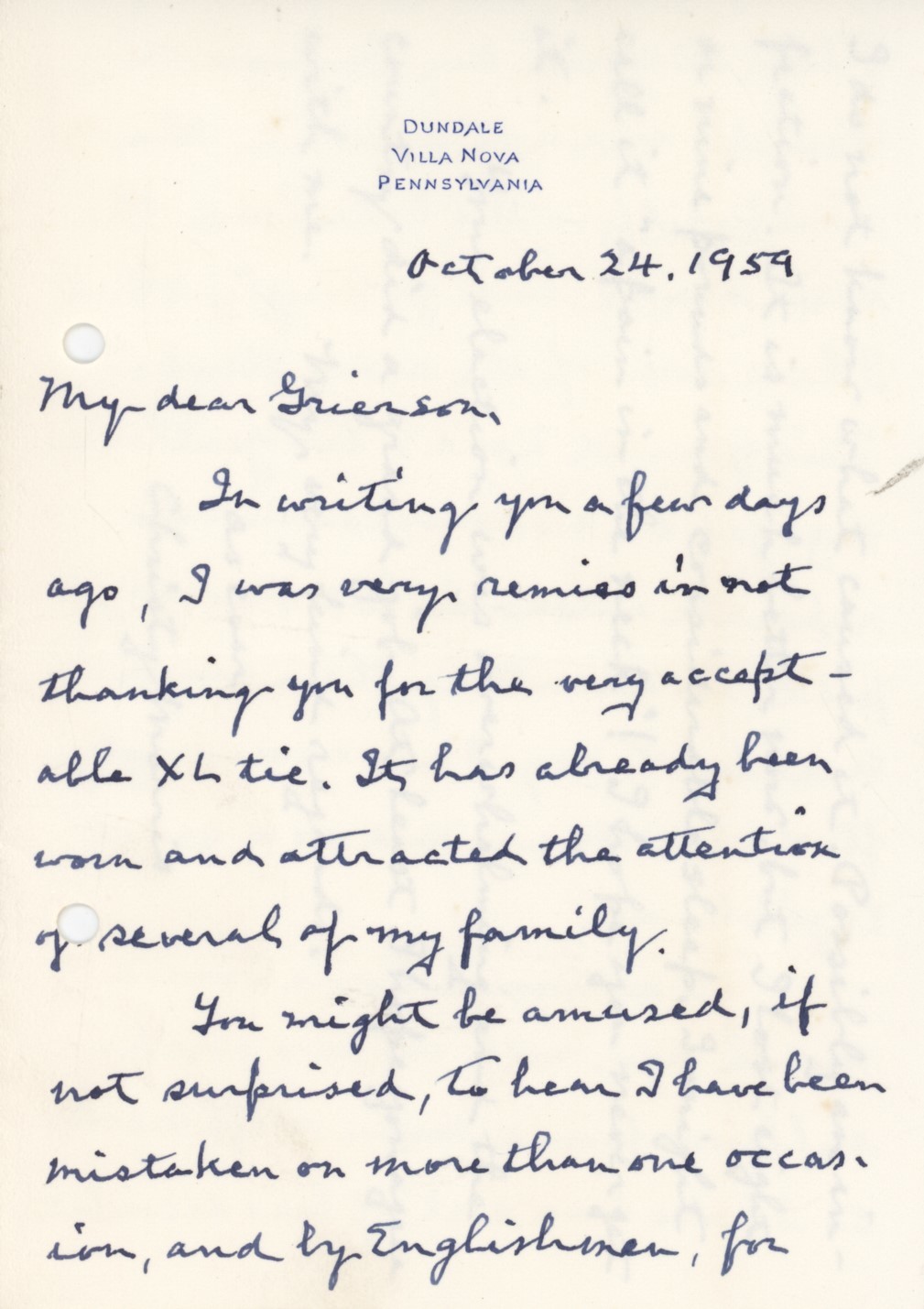 Handwritten letter from the American cricketer to Henry Grierson regarding the Forty Club and other matters (including being mistaken for Plum Warner), dated 24 October 1959. Signed "Christy Morris".