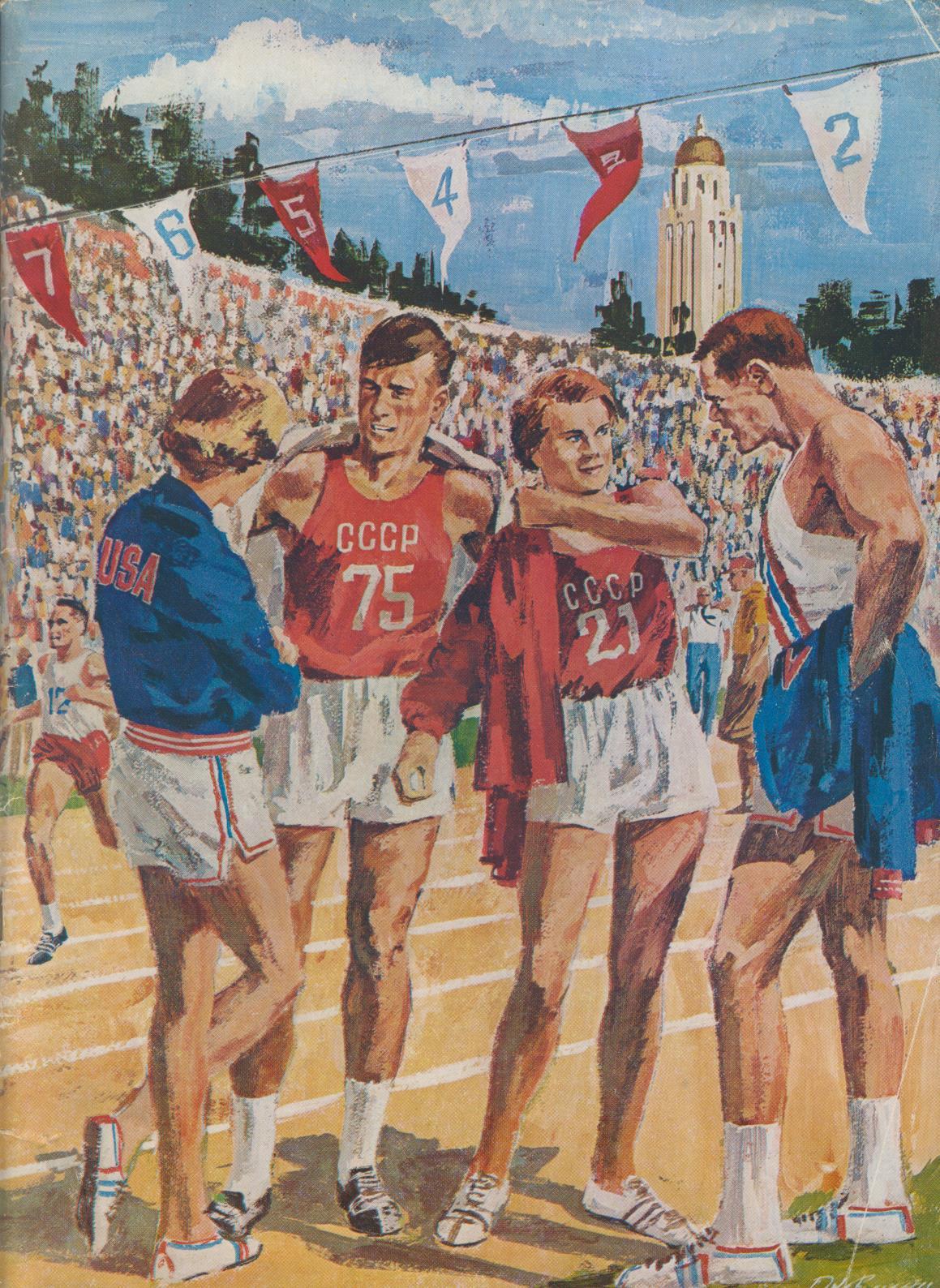 Official programme for the famous athletics meeting between the USA and the USSR held at Stanford University on July 21-22, 1962. Somehow the two Cold War enemies managed to stage yearly athletics meetings - this one just a short while before the Cuban Missile Crisis. There were some impressive athletic performances during the two days but it will be best remembered for the vast crowds and the excellent sportsmanship of both teams despite the ongoing political crisis.