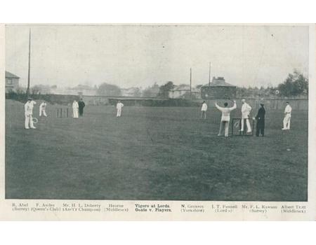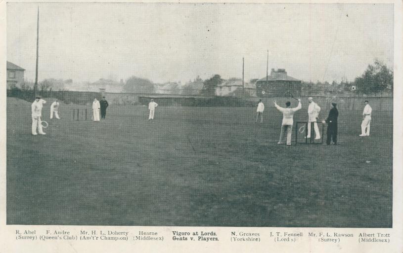 Original postcard of a game of Vigoro being played at Lord's Cricket Ground on October 17th 1902. Vigoro was a sport invented in 1901 by John George Grant and combined elements of cricket and tennis. The caption refers to this match as Gents v Players but other sources call it Middlesex v Surrey. What we do know is that the match was played in front of the MCC Committee and that one team was led by Eustace Miles, the real tennis player, and also included Wimbledon Champions Laurence and Reginald Doherty. Their opponents were led by Surrey cricketer Bobby Abel - players pictured are listed on the front of the card and include Abel, F. Andre (Queen's Club), HL Doherty, Hearne (Middlesex), Greaves (Yorkshire), J.T. Fennell (Lord's), F.L. Rawson (Surrey) and Albert Trott (Middlesex). Fennell and Rawson were real tennis players. The tennis players won the match comfortably as they were more used to the equipment. Vigoro never really caught on in England but a version of the game is still played in certain Australian states.