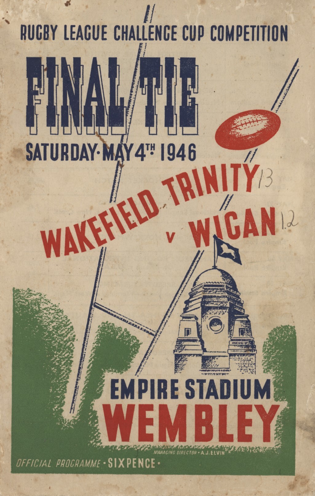 Official progamme for the 1946 Challenge Cup Final between Wakefield Trinity and Wigan, played at Wembley. Trinity won a thrilling match 13-12.