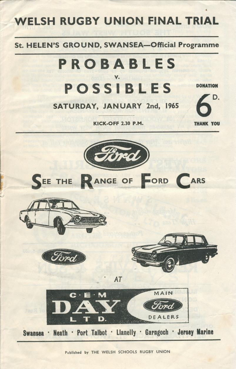 WALES PROBABLES V POSSIBLES 1965 RUGBY PROGRAMME