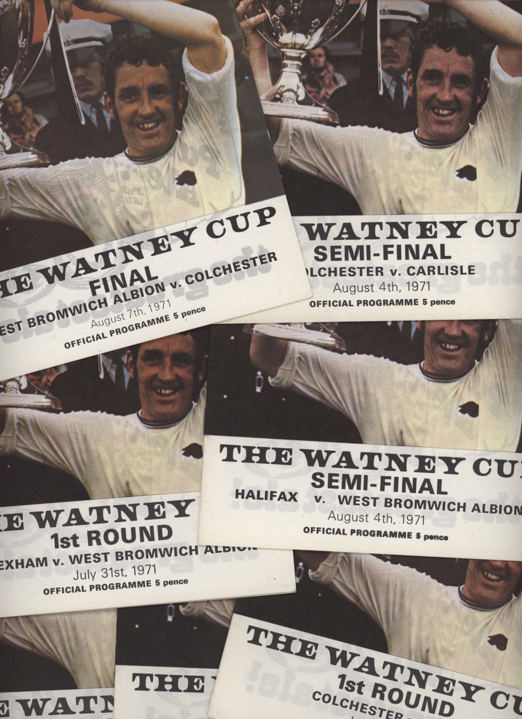 A full set of programmes for the 1971 Watney Cup competition. Four 1st round matches, 2 semi-finals and the final, in which Colchester United defeated West Bromwich Albion.