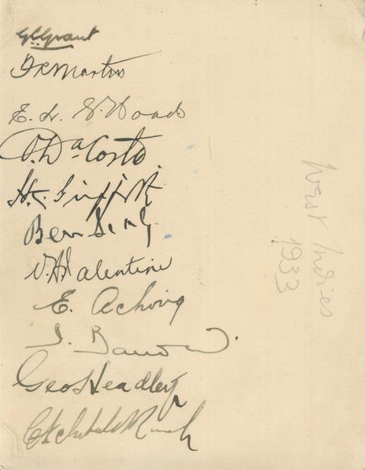 Blank postcard. Signed in ink by the West Indian cricket team that played Glamorgan at Cardiff Arms Park on June 3-6, 1933. The signatures are GC Grant, CA Roach, EE Achong, BJ Sealey, GA Headley, HC Griffith, I Barrow, FR Martin, ELG Hoad, VA Valentine and OC DaCosta. Valentine has signed instead of Martindale, who is recorded as playing in the game.