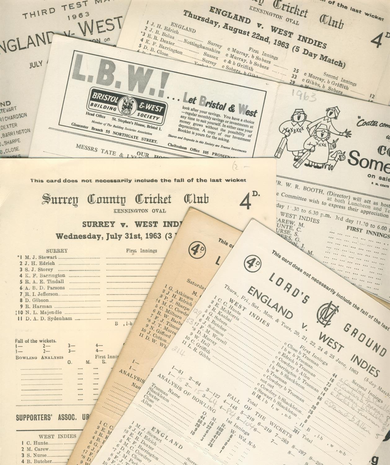 Collection of scorecards from the West Indies cricket tour of England in 1963, including three Test matches - Lord's, Edgbaston and the Oval. Also included are scorecards for matches against Surrey, Middlesex, MCC and Gloucestershire (7 in total). All are in at least good condition, some with scores inserted in ink.