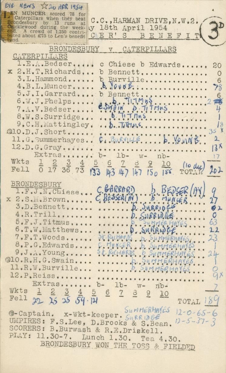Official scorecard for the match played at Brondesbury on April 18th, 1954. This was for Len Muncer's Benefit season, who had played for both Middlesex and Glamorgan. Fred Titmus turned out for Brondesbury, while the Caterpillars could boast both Bedsers, Muncer and Surridge.