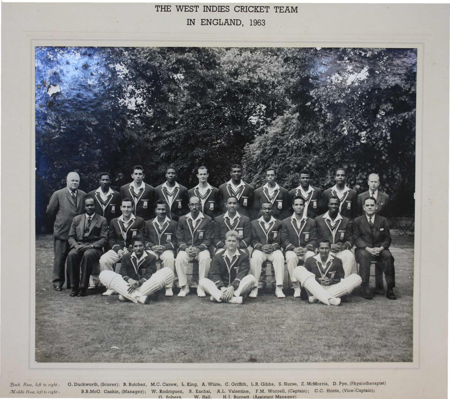 Official photograph of the 1963 West Indies touring party to England. The team included Griffith, Gibbs, Kanhai, Valentine Worrell, Hunte, Sobers, Hall and Murray.