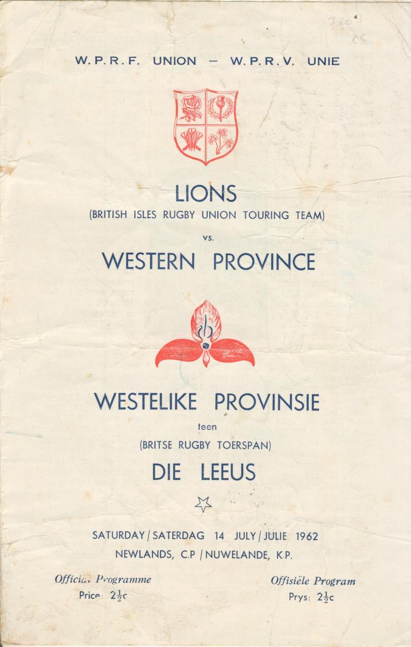 Official rugby programme for the tour match between Western Province and the British Lions at Newlands, Cape Town on July 14, 1962. The Lions won 21-13.