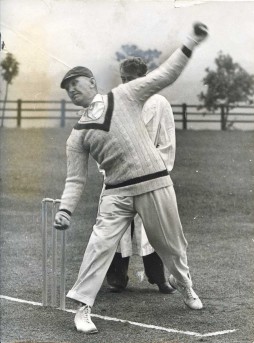 Original Press cricket photograph of the ex-Yorkshire and England player bowling in a charity match at the age of 71. He was bowling to Brian Sellers at the opening of the new cricket ground at Silcoates School in Wakefield.