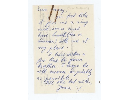 Short handwritten note on the back of a compliments slip written by the well-respected Austrian-Jewish sports journalist Willy Meisl and addressed to Danny (Blanchflower). He invites Blanchflower to visit him and also says that "I have written a few lines to your brother. I hope he will recover as quickly as possible - all the best wishes ...". Jackie Blanchflower was, of course, badly injured in the Munich Air Disaster and never did recover fully.