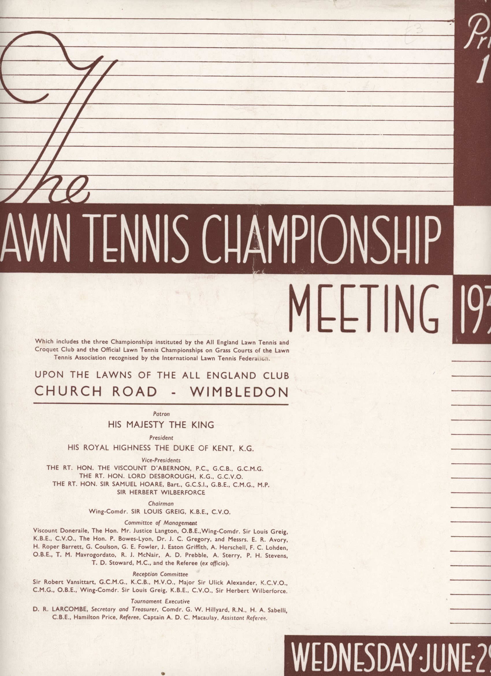 Official daily programme for Wednesday June 29th 1938. Men's semi-finals day. Don Budge won the Men's Singles and Helen Wills Moody the Women's title.