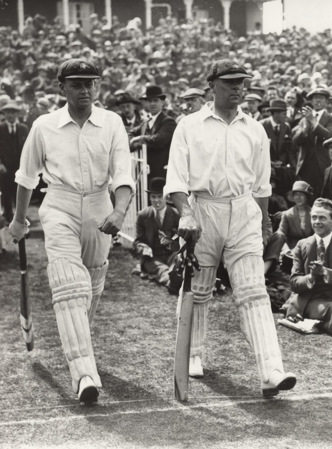 Press photograph of Bill Woodfull and Warren Bardsley going out to bat at Headingley during the Ashes cricket tour of 1926.