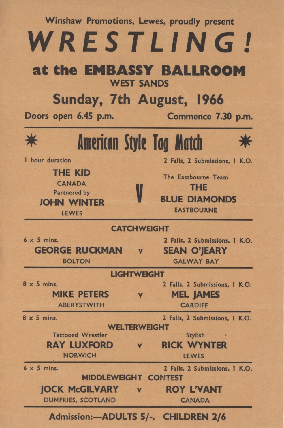 Original flyer for an evening of wrestling held at the Embassy Ballroom, West Sands, on August 7th, 1966. Performers included The Blue Diamonds, George Ruckman, Rick Wynter, Sean O'Jeary etc.