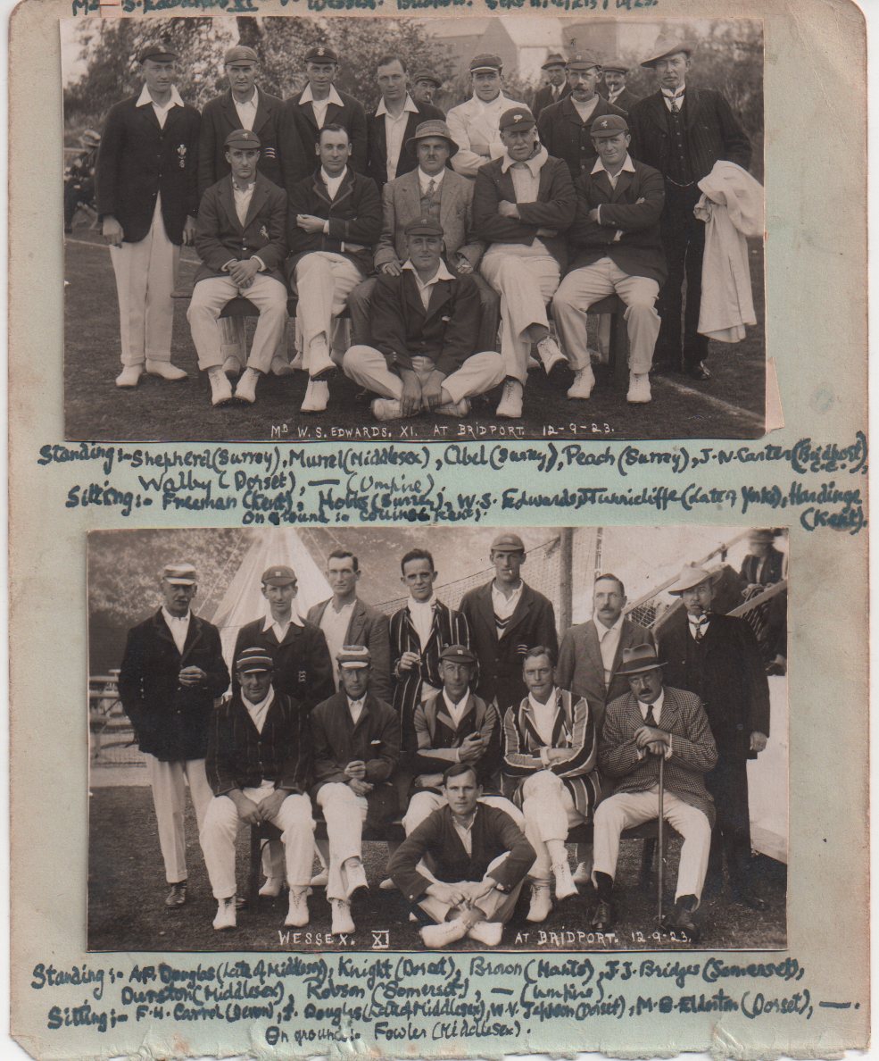 Cricket postcards. Black and white real photographs by TIC of the two teams who contested the match between Mr. W.S. Edward's XI and a Wessex XI, played at Bridport on the 12th of September 1923. Both teams contained several 1st Class cricketers, most notably Hobbs, Durston, Freeman and Hardinge. Also on Mr. Edward's XI was the 58 year old ex-Yorkshire opening batsman John Tunnicliffe. Also included Shepherd, Abel, Peach (all Surrey), Murrell (Middx), Collins (Kent), Brown (Hants), Bridges, Robson (both Somerset) and Fowler (Middx).