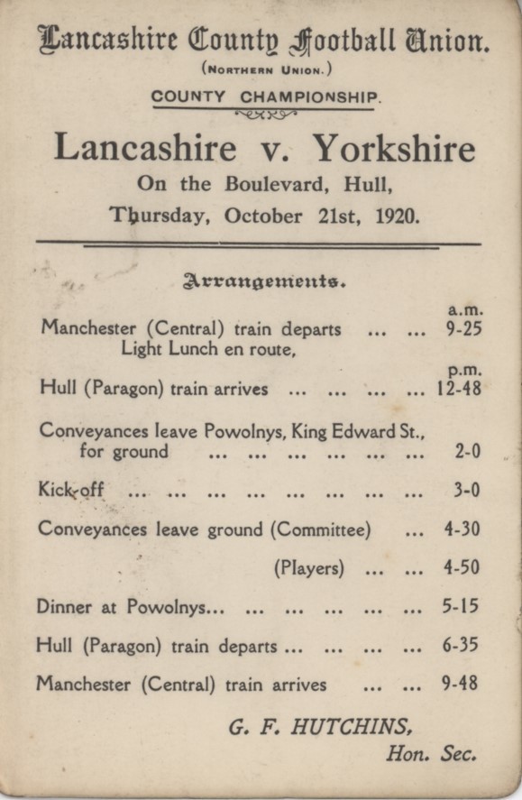Rugby League » Memorabilia » General » YORKSHIRE V LANCASHIRE 1920 RUGBY LEAGUE MATCH - PLAYERS' ITINERARY