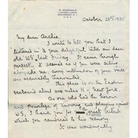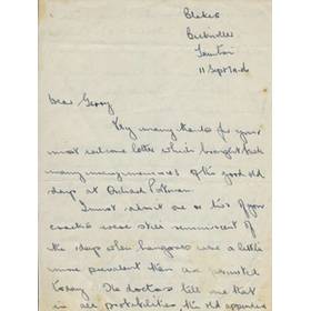 Cricket autograph. Handwritten letter to Archie MacLaren, mainly reminiscing about old friends. "Funny to think back, I remember travelling up in your carriage from Brisbane to Toowoomba, and you were