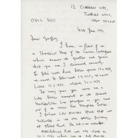 Handwritten letter from G.E. Livock (Middlesex 1925-27) to the cricket collector Geoffrey Copinger. Livock is confirming in the letter the identities of some players featured in a postcard from Copinger's