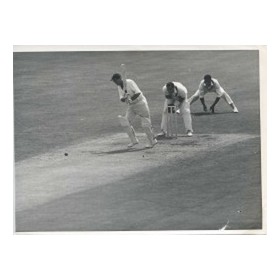 Original Press cricket photograph from the second Test match at Lord's. Morris gets the ball past Trevor Bailey in the slips off the bowling of Freddie Brown. 10 x 15cm. Original Press copyright