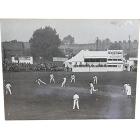 Original Press photograph (actually two taped together) from the 1934 Old Trafford Test match against Australia - showing Maurice Leyland cutting Wall through the slips during his innings of 153. Les Ames