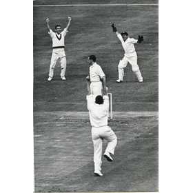 Original Press photograph showing John Gleeson nearly running out Ted Dexter in the 5th Test at the Oval, dated August 22nd, 1968. Dexter was given not out although from the angle of this photograph it