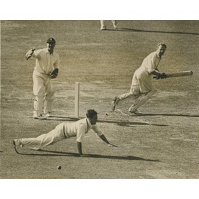Black and white Press cricket photo of Don Tallon being caught spectacularly by JF Crapp, during the Oval Test Match. Godfrey Evans looks on. Central Press Photos Ltd, London. 15 x 10.5cm. Press