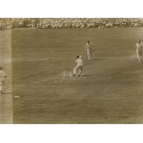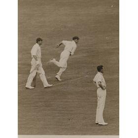 Original Press photograph of Grimmett bowling to Herbert Sutcliffe (out of shot) during England's first innings. Wally Hammond was at the non-striker's end. 20 x 15cm. Press caption to reverse. Good condition.