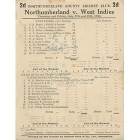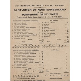 Original scorecard from the match played on August 2-3, 1901. Northumberland won by an innings thanks to a century from F.G.H. Clayton. 15 x 11.5cm. Fully printed. Light central fold. Very good condition.