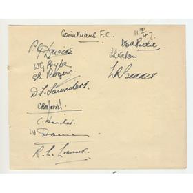 Small album page, signed by 11 players for Corinthian-Casuals F.C. from the 1947 season. 10 x 12cm. Very good condition.