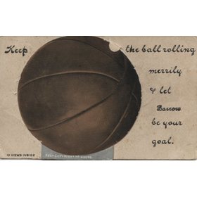 Unusual novelty football postcard with a football that unfolds to reveal a view of Duke Street, Barrow-In-Furness. The card reads 'Keep the ball rolling & let Barrow be your goal.' 9 x 14cm. Postally