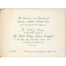 An invitation to the opening of the Club's Valley Leisure Complex at Charlton Athletic Football Club on August 25th 1981. 15 x 20cm. Very good.