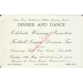 Invitation card for the Luton Town dinner and dance to celebrate winning promotion to Division Two, held at the Queensway Hall, Dunstable, on May 26th 1970. 11 x 17.5cm. Very good condition.