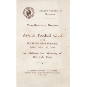 Original menu card for a dinner and dance held in honour of the two Cup Final teams on April 26th, 1930 (after the match) at the Hotel Great Central. Arsenal won the match 2-0. 8pp, bound with ribbon.
