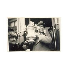 Football postcard. Real photograph showing a Bolton Wanderers player in civilian clothes (possibly Jack Smith) holding the FA Cup aloft after the 1923 Cup Final (White Horse). He may be boarding