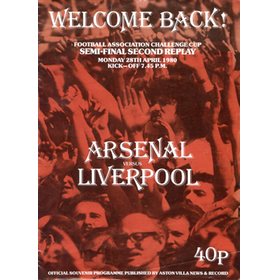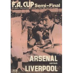 Official souvenir programme for the replay of the 1980 FA Cup Semi-final between Arsenal and Liverpool played at Villa Park. 21 x 29.8cm. 20pp including illustrated paper wrappers. Very good