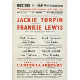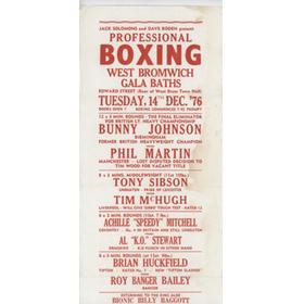 Original boxing flyer for the fight held at Wolverhampton Civic Hall on 26th May 1976. Tony Sibson v Gareth Jones was also on the card. The flyer is a little too large for our scanner. 37 x 25cm. Light