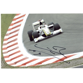Original motor racing Press photograph of the British F1 star in an un-numbered Virgin Racing F1 car ( during testing?). Signed by Jenson Button in ink across the front. 30.4 x 20.3cm. Very good