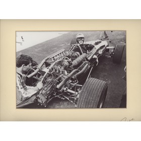 Photograph by the well-known motor racing photographer, Maurice Rowe, of Jochen Rindt at Brands Hatch in 1967 in his Cooper-Maserati, with a very young Ron Dennis taking a look at the engine. Ink note