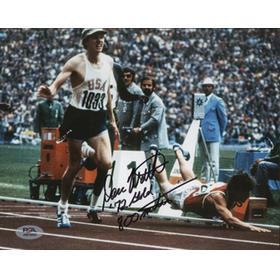 Colour photograph signed by Wottle (USA 1033) across the front in black pen. The photo was taken as he completed an incredibe late surge to take the 800m Olympic Gold Medal. The photograph is a later printing