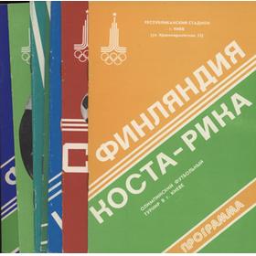 A set of seven football programmes from the Moscow Olympics of 1980, all matches played in Kyiv. Include Finland v Iraq, East Germany v Algeria, Costa Rica v Iraq, East Germany v Iraq, East Germany v Spain,
