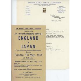 Original handbill advertising the table tennis match between England and Japan, held at Crystal Palace on May 4th, 1965. Comes with a signed letter from Conrad Jaschke, Chairman of the Organising Committee,