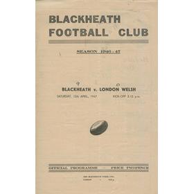 Official programme for the match played on April 26th 1947. Blackheath won the match 14-5. Press cutting pasted neatly to inside. 24.5 x 16.5cm. Single folded sheet. Score written neatly to front. Very