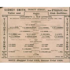 Printed on card showing the players and positions for the match between Oxford University and Old Merchant Taylors in Oxford on October 18 1919. Measures 14 x 9cm. Printed on one side only. Fine